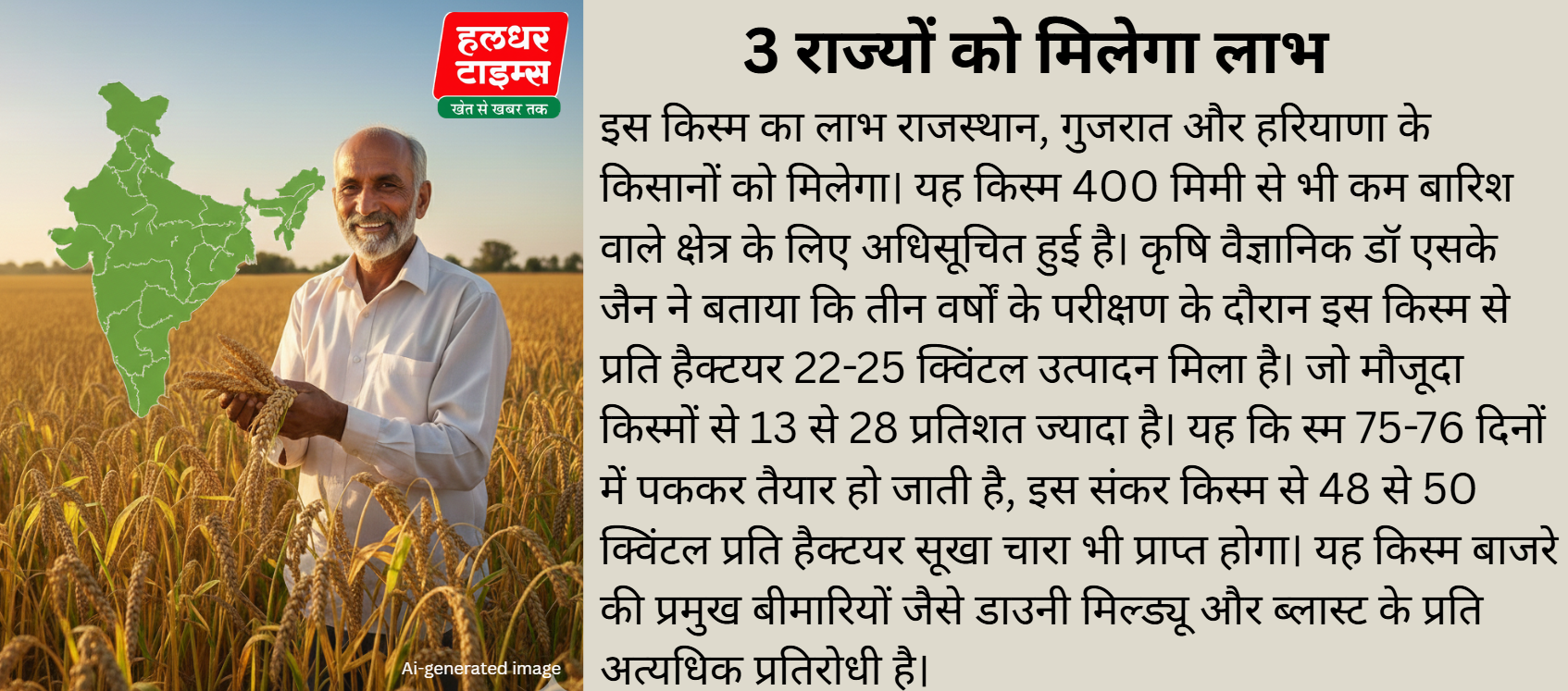 गौरतलब है कि यह किस्म न केवल सूखा सहनशील है। बल्कि, पैदावार और पोषण के मामले में भी बेहत्तर है। बता दें कि प्रदेश में 42 से 45 लाख हैक्टयर क्षेत्र में बाजरे की खेती होती है। इस किस्म के विकास में