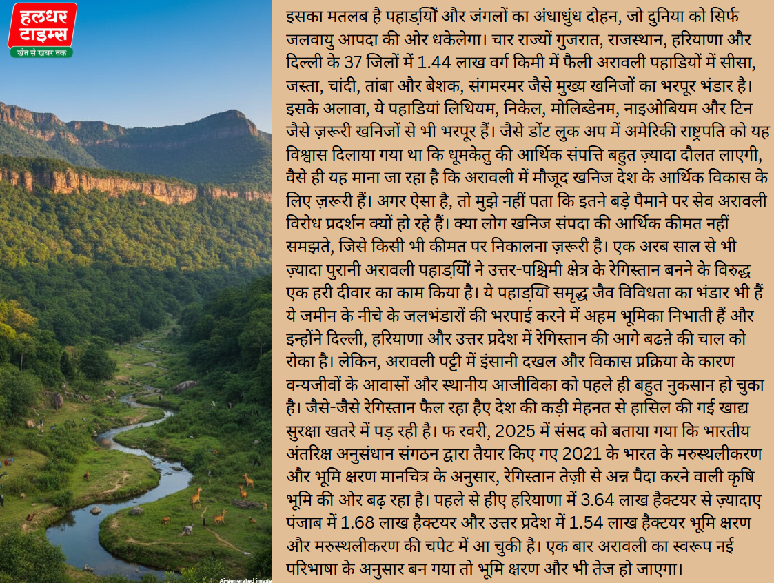 (सभी तस्वीरें- हलधर)वर्ष 2021 की हॉलीवुड व्यंग्य फि ल्म डोंट लुक अप में, दो अमेरिकी खगोलशास्त्री दुनिया को एक धूमकेतु के बारे में चेतावनी देते हैं, जो पृथ्वी की ओर तेज़ी से बढ़ रहा है। हालांकि, अमेरिकी राष्ट्रपति एक अरबपति के झांसे में आ जाते हैं, जो यह दावा करता है कि उस आकाशीय पिंड में खरबों डॉलर के दुर्लभ तत्व हैं। आखिरकार, धूमकेतु पृथ्वी से टकराता है, जिससे एक वैश्विक आपदा बनती है। काश! फिल्म के मुख्य किरदारों ने प्राकृतिक संसाधनों की लूट के भयानक परिणामों के बारे में संज्ञान लिया होता, जैसा कि उत्तर भारत के हरे फेफ डे पुकारी जाने वाली और पर्यावरण सुरक्षा के लिए अति संवेदनशील किंतु क्षतिग्रस्त की जा चुकी अरावली पर्वत शृंखला की प्रस्तावित 100 मीटर की परिभाषा से साफ था तो फिल्म का शीर्षक डोंट लुक अप, लुक डाउन होता। यह वही हैए, जिसकी चेतावनी महात्मा गांधी ने यह कहकर दी थी, दुनिया में हर किसी की ज़रूरत के लिए काफ ी है। लेकिन , हर किसी के लालच के लिए नहीं।