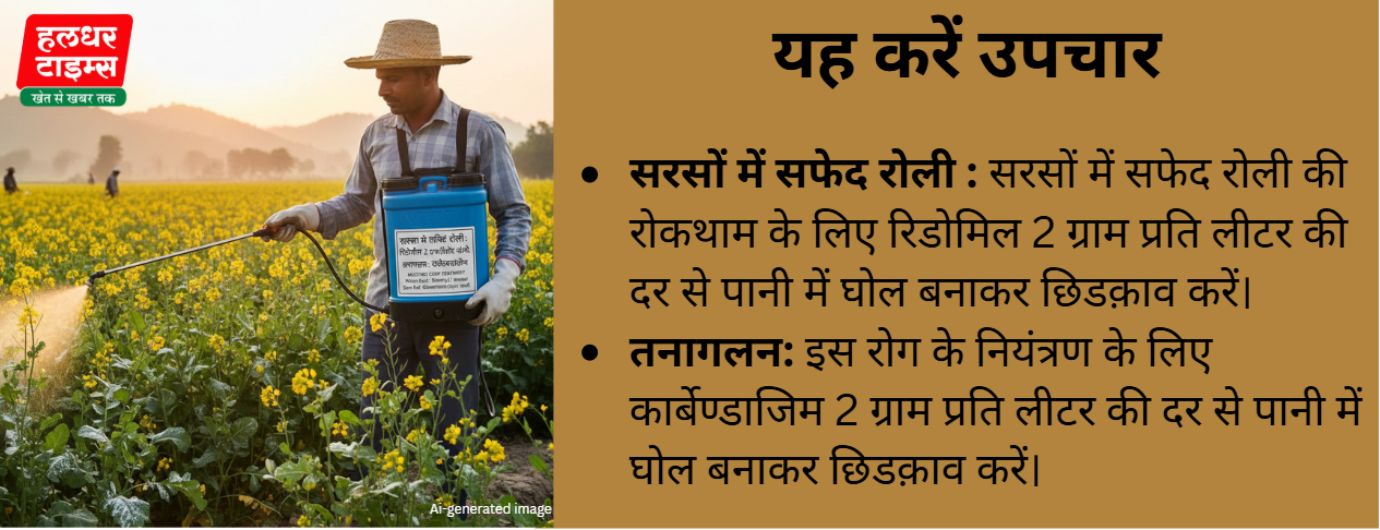 उन्होने बताया कि सफेद रोली सरसों का बीज -भूमि जनित रोग है। इसके कारण पत्तियों की सतह पर सफेद रंग के उभरे हुए फफोले दिखाई देते हैं। फफोलों के फटने पर सफेद चूर्ण पत्तियों पर फैल जाता है। पीले रंग के धब्बे आपस में मिलकर पत्तियों को पूरी तरह से ढक लेते हैं। इससे पुष्पीय भाग और फलियां पूरी तरह से विकृत हो जाती है। जिससे फलियों में बीज नहीं बन पाता है। इसके अलवा कड़ाके की इस सर्दी में तुलासिता रोग भी फैलता है। इस रोग में सरसों की पत्तियों की निचली सतह पर बैंगनी-भूरे रंग के धब्बे बनते है। यह रोग तीव्रता से फैलता है। इससे फसल के फूल नष्ट हो जाते है।