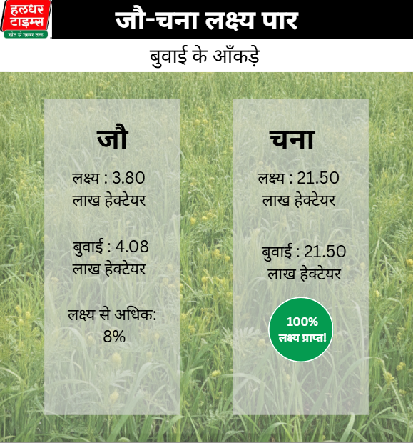 रबी फसल की बुवाई एक करोड़ 20 हजार हैक्टयर लक्ष्य के मुकाबले 1 करोड़ 8 लाख हैक्टयर में हो चुकी हैं। जो लक्ष्य का 91 फीसदी हैं। अब बुवाई में बढ़ोत्तरी की संभावना गेहूं से हैं। दूसरी फसल का बुवाई समय निकल चुका हैं। गौरतलब है कि इस साल जौ की बुवाई लक्ष्य से 8 फीसदी ज्यादा हुई है।