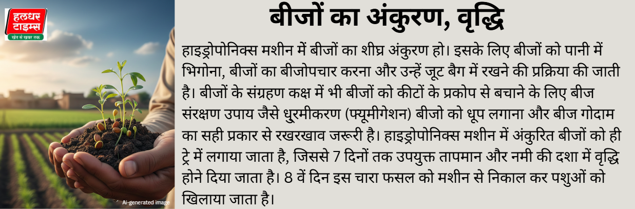 (सभी तस्वीरें- हलधर)देश के दुग्ध उत्पादन में सालाना आधार पर 4.04 प्रतिशत की वृद्धि दर्ज की गई है। जबकि, वैश्विक औसत 2.2 प्रतिशत हैं। हरा चारा दुधारू पशुओं का मुख्य आहार है। हरे चारे के उपयोग से पशु के उत्पादन, स्वास्थ्य और प्रजनन क्षमता में वृद्धि होती है। वर्षभर हरे चारे की मांग को देखते हुए कृषि वैज्ञानिकों ने ऐसी तकनीक का विकास किया है, जिसे हाइड्रोपोनिक्स कहा जाता है। इस तकनीक से वर्षभर कम लागत पर हरे चारे का उत्पादन लिया जा सकता है। आपको बता दें कि पशुपोषण में हाइड्रोपोनिक्स चारे के उपयोग से दाना मिश्रण की मात्रा में कमी करके पशुपालन को लाभकारी बनाया जा सकता है।