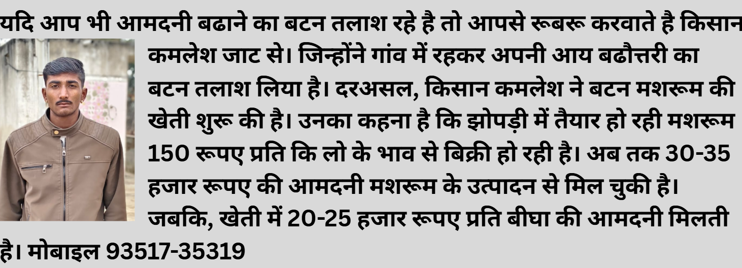 पिपरड़ा, राजसमंद। गांव में रहकर भी आमदनी को बढाया जा सकता है। क्षेत्रीय युवाओं को आय बढौत्तरी की राह दिखाने का ऐसा ही प्रयास किया है किसान कमलेश जाट ने। जिन्होंने बटन मशरूम की खेती करके खेती से अतिरिक्त कमाई का जरिया अपने लिया तलाश लिया है। उनका कहना है कि झोपड़ी में तैयार हो रही मशरूम 150 रूपए प्रति किलो के भाव से बिक्री हो रही है। जबकि, किसान कमलेश की खेती से सकल आय का आंकड़ा सालाना 2 लाख रूपए के करीब है। किसान कमलेश ने हलधर टाइम्स को बताया कि मशरूम उत्पादन के बारे में पहले सुना ही था। लेकिन, तीन-चार साल पहले एक दोस्त को किसी के मशरूम फार्म पर काम करने का मौका मिला। इसके बाद कृषि विज्ञान केन्द्र से हमने सम्पर्क किया। यहां से तकनीक जानकारी मिलने के बाद इस साल 40 गुना 24 के शैड में बटन मशरूम का उत्पादन लेना शुरू किया। उन्होने बताया कि मशरूम का उत्पादन जारी है। अब तक 35 हजार रूपए की आमदनी प्राप्त हो चुकी है। उम्मीद है कि मशरूम की खेती से डेढ़ से दो लाख रूपए की अतरिक्त आमदनी प्राप्त हो जायेगी।