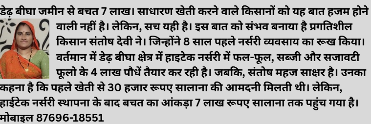 पुर, भीलवाड़ा। डेढ़ बीघा जमीन से 15 लाख की आमदनी। लाभ का यह आंकड़ा दांतों तले अंगुली जरूर दबाने को मजबूर कर देगा। लेकिन, सच यही है। इतनी आमदनी संभव हो रही है हाईटेक नर्सरी के व्यवसाय से। हाईटेक नर्सरी की शुरूआत बिस्वा भर जमीन से हुई। लेकिन, अब डेढ़ बीघा जमीन अपने नाम कर चुकी है। इससे सालाना 6-7 लाख रूपए का शुद्ध मुनाफा मिल रहा है। कुछ ऐसा ही कमाल करने वाली महिला कृषक है संतोष देवी। जो नर्सरी में सब्जी, फल-फूल और सजावटी पौध तैयार कर रही है। किसान संतोष ने हलधर टाइम्स को बताया कि आठ साल पहले तक खेतों से 25-30 हजार रूपए की आय मिला करती थी। लेकिन, नर्सरी स्थापना के बाद से साल दर साल नर्सरी का क्षेत्र और आय का आंकड़ा बढ़ता जा रहा है। उन्होंने बताया कि पुणें और गुजरात भ्रमण के दौरान नर्सरी व्यवसाय के बारे में जानने सीखने को मिला। शुरूआत एक बिस्वा जमीन से करके देखी। अब डेढ़ बीघा क्षेत्र में हाईटेक तकनीक को अपनाते हुए विभिन्न सब्जी फसलों के पौधे तैयार कर रही हॅू। उन्होंने बताया कि पहले खेतों में रबी-खरीफ फसलों का उत्पादन लेते थे। इससे कोई खास-आमदनी नहीं मिल पाती थी। लेकिन, संतोष यह था कि जमीन खाली नहीं है। बता दें कि संतोष के पास कुल 2 बीघा जमीन है। सिंचाई के लिए कुआं है। लेकिन, पानी लवणीय है। उन्होंने बताया कि पानी की लवणीयता के कारण शुरूआती साल में पौध तैयार करने में थोड़ी परेशानी आई। इसके बाद फार्म पौंड का निर्माण करवाया। इससे सिंचाई के लिए बरसाती पानी मिलने लगा है। गौरतलब है कि किसान संतोष ने 500 वर्ग मीटर क्षेत्र में पॉली हाउस और 1000 वर्ग मीटर क्षेत्र में नेट हाउस बनाया हुआ है। संतोष महज साक्षर है, लेकिन, फर्टीगेशन, वेंचुरी, ईसी-पीएच चेक करने वाले उपकरणों का बेहत्तर इस्तेमाल कर रही है।