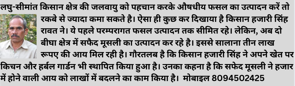 काछबली, राजसमंद। जैविक औषधीय फसल और इंटर क्रॉपिंग से कृषिगत आय को लाखों में बदला जा सकता है। यकीन नहीं है तो मिलिए किसान हजारी सिंह रावत से। जो पहले परम्परागत फसलों के उत्पादन से सालाना 50-60 हजार रूपए कमाते थे। लेकिन, अब औषधीय फसल के उत्पादन से सालाना तीन लाख रूपए की आमदनी प्राप्त कर रहे है। गौरतलब है कि किसान हजारी सिंह जड़ी-बूटी युक्त सफेद मूसली की बर्फी भी तैयार कर रहे है। किसान हजारीलाल ने हलधर टाइम्स को बताया कि परिवार के बंटवारे के बाद 4 बीघा जमीन हिस्से आई। खेती से जुडऩे के बाद परम्परागत फसलों का उत्पादन लेता रहा। लेकिन, बढ़ते खर्च से पार पाने के लिए कुछ नया करना जरूरी हो गया था। उन्होंने बताया कि प्रवास के दौरान औषधीय फसल उत्पादक किसानों से मुलाकात हुई। फिर, उनके खेत पर जाकर सफेद मूसली सहित दूसरी औषधीय फसलो के उत्पादन को देखा। यही से आर्थिकी का चक्र घूमाने का आइडिया मिला और अब परिणाम सबके सामने है। उन्होंने बताया कि सिंचाई के लिए एक कुआं है और परिवार की आवश्यकता पूर्ति के लिए दो बीघा में गेहूं, जौ, मैथी और चना फसल का उत्पादन लेता हॅॅू। इन फसलों से थोड़ी बहुत आय मिल जाती है।