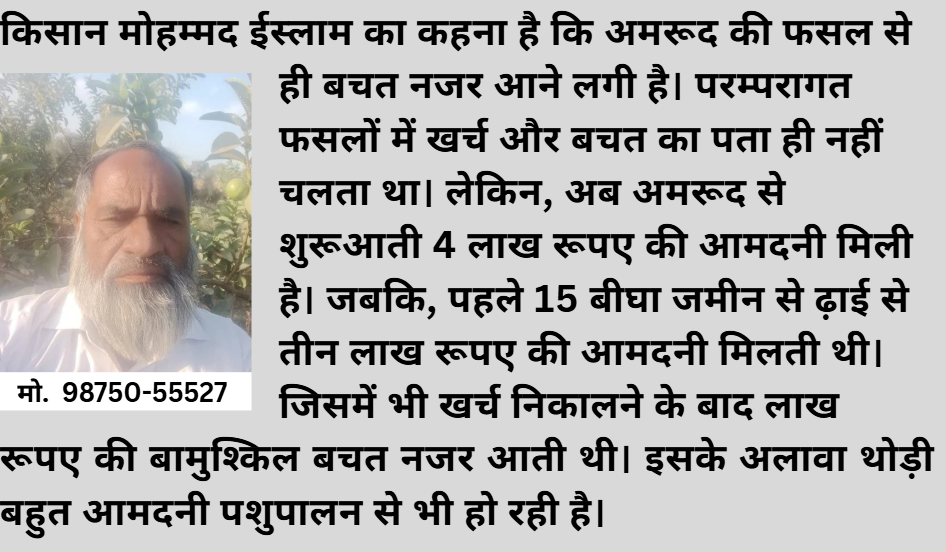 मोडक़, कोटा। बागवानी फसलों का उत्पादन किसानों को पंख देते देर नहीं करता है। यकीन नहीं है तो किसान मोहम्मद ईस्लाम से मिलिए। यह किसान परम्परागत फसलों का उत्पादन करके सालाना लाख से सवा लाख रूपए की शुद्ध बचत ले पाता था। लेकिन, अब जमीन के आधे रकबे से 4 लाख रूपए का शुद्ध लाभ ले रहा है। आमदनी के आंकड़े में यह बूम देखने को मिला है अमरूद की खेती से। उनका कहना है कि बागवानी फसलों से परम्परागत फसलो से ज्यादा आमदनी मिलती है। इन फसलों की लागत काफी कम है। जबकि, आमदनी ज्यादा। किसान मोहम्मद ईस्लाम ने हलधर टाइम्स को बताया कि मेरे पास 15 बीघा कृषि भूमि है। 10वीं पास करने के साथ ही मैं खेती से जुड़ गया। लेकिन, उस समय खेती मेें दम नहीं देखकर आईस फैक्ट्री शुरू कर दी। बर्फ बनाता और बिक्री करता। करीब तीन दशक तक यह काम किया। लेकिन, अब बर्फ की मांग काफी कम हो चुकी है। इस कारण परिवार का खर्च निकालना मुश्किल होता जा रहा था। उन्होंने बताया कि फैक्ट्री को बंद करके कुछ नया करने के लिए खेती से जुड़ा और उद्यान विभाग की सहायता से 4 साल पहले अमरूद का बगीचा स्थापित किया। इससे अब उत्पादन मिलने लगा है। उन्होंने बताया कि परम्परागत फसलो की तुलना में मुझे बागवानी फसलों का हिसाब अच्छा लगा। एक बार निवेश के बाद इसमें लाभ ज्यादा और खर्च काफी कम है। उन्होंने बताया कि सिंचाई के लिए मेरे पास ट्यूबवैल है और एक कुआं भी है। परम्परागत फसलों में सरसों, गेहूं, सोयाबीन का उत्पादन लेता हॅू। इन फसलों से सालाना लाख रूपए की आमदनी मिल जाती है।