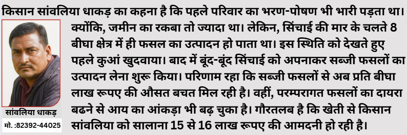 ऊंडवा, कोटा। बूंदों की अपनी अलग कहानी है, कही क्रांति तो कही खेतों में रवानी है। जी हां, सिंचाई के मायने किसान से ज्यादा कोई नहीं समझ सकता। क्योंकि, फसल उत्पादन ही नहीं, किसान को पूरा आर्थिक तंत्र ही बूंदो पर निर्भर करता है। इस बात को समझा है किसान सांवलिया धाकड़ ने। जो बूंद-बूंद के सहारे ओपन फील्ड में सब्जी फसलो का उत्पादन कर रहे है। साथ ही, प्रति बीघा 80 हजार से एक लाख रूपए तक आमदनी प्राप्त कर रहे है। जबकि, खेती से सकल आय का आंकड़ा करीब 15-16 लाख रूपए के करीब है। किसान सांवलिया ने हलधर टाइम्स को बताया कि परिवार के पास 33 बीघा कृषि भूमि है। उनहोंने बताया कि 10वीं पास करने के साथ ही खेती से जुड़ गया। लेकिन, उस समय महज 8 बीघा क्षेत्र में खेती होती थी। इस कारण परिवार की रहगुजर चलाना भी भारी पड़ता था। लेकिन, अब बूंद-बूंद से हालात बदल चुके है। जो खेत कभी बारानी रहते थे, अब उनसे लाखो मिल रहे है। उन्होंने बताया कि कई साल तक बारानी खेती की। इससे थोड़ी-थोड़ी बचत करके वर्ष 2014 में कुआं खुदवाया। बाद में नहर का पानी भी उपलब्ध होने लगा। पूरी जमीन में सिचाई सुविधा विकसित होने के बाद आय बढौत्तरी के बार में सोचना शुरू किया। यह तलाश सब्जी फसलों पर जाकर खत्म हुई। उन्होंने बताया कि परम्परागत फसलों में लहसुन, चना, सोयाबीन और मूंगफली का उत्पादन लेता हॅू। इन फसलों से सालाना 5 लाख रूपए की आमदनी मिल जाती है।