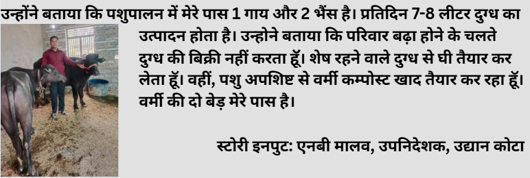 उन्होने बताया कि उद्यानिकी विभाग की अनुदान योजना का लाभ उठाते हुए एक हैक्टयर क्षेत्र में संतरे का बगीचा स्थापित किया है। पौधें डेढ़ साल के हो चुके है। उन्होने बताया कि अभी बगीचे से उत्पादन और आय मिलने में दो साल और लगेंगे।