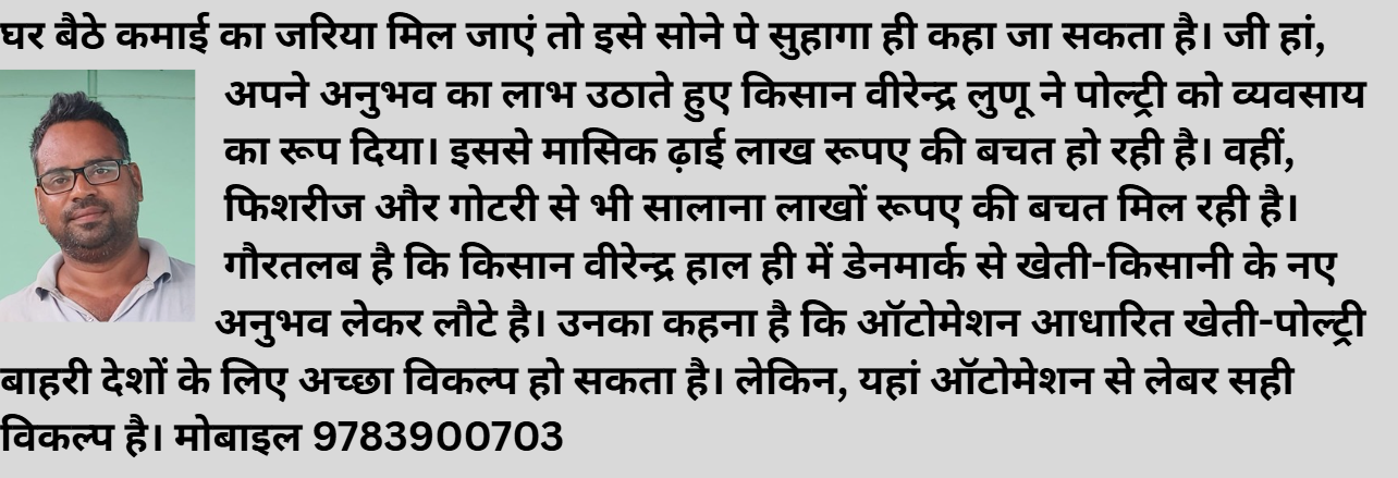 बेलासर, बीकानेर। ना तो यह किसी उद्योग के मालिक है, ना ही कोई बडे कारोबारी। कारोबार और उद्योग से दूर तक वास्ता नहीं है। फिर भी, घर बैठे मासिक लाखों रूपए कमा रहे है। जी हां, पोल्ट्री-गोटरी और फिशरीज के बलबूते कुछ ऐसी ही कहानी लिख रहे है डेनमार्क रिर्टन वीरेन्द्र लुणू। जो पोल्ट्री से मासिक ढ़ाई लाख रूपए की बचत ले रहे है। जबकि, फिशरीज और गोटरी से भी सालाना लाखों रूपए की बचत प्राप्त कर रहे है। गौरतलब है कि 5 साल पहले वीरेन्द्र ने 10 मुर्गियों के सहारे पोल्ट्री क्षेत्र में कदम रखा था। किसान वीरेन्द्र ने हलधर टाइम्स को बताया कि परिवार के पास 32 बीघा जमीन है। खेतों में अब भी परम्परागत फसलों का उत्पादन हो रहा है। लेकिन, मेरे खेती से जुडऩे के बाद खेती से होने वाली आय का ग्राफ पोल्ट्री, गोटरी और फिशरीज से मिलने वाली आमदनी की तुलना में छोटा नजर आने लगा है। बता दें कि वीरेन्द्र ने पॉलिटेक्निक करने के बाद रोजगार के लिए मुर्गीपालन को चुना। उन्होने बताया कि 10 मुर्गियों से सहारे उद्यम शुरू किया। थोड़ा मुनाफ दिखा तो मुनाफे का निवेश पक्षियो की संख्या बढाने में किया। समय के साथ उद्यम चल निकला और अब वैज्ञानिक तौर-तरीके से मुर्गीपालन कर रहा हॅू। उन्होंने बताया कि वर्तमान में मेरे पास मुर्गियों की संख्या 500 के करीब है। वहीं, मुर्गियों से सालाना ढ़ाई लाख रूपए की बचत मिल जाती है। उन्होने बताया कि परम्परागत फसलों में मूंगफली और गेहूं का उत्पादन लेता हॅॅू। इन फसलों से सालाना 5 लाख रूपए सालाना की आय हो जाती है। गौरतलब है कि राज्य सरकार द्वारा हाल ही में डेनमार्क भेजे गए किसान दल के सदस्य भी रहे है। उन्होने बताया कि डेनमार्क में खेती ऑटोमेशन पर आधारित है। क्योंकि, वहां लेबर नहीं है। जबकि, यहां लेबर है, जो ऑटोमेशन से सस्ता विकल्प है। यदि यहां ऑटोमेशन को लागू कर दिया जाएं तो कृषि मजदूरों के सामने रोजगार का संकट खड़ा हो जायेगा।