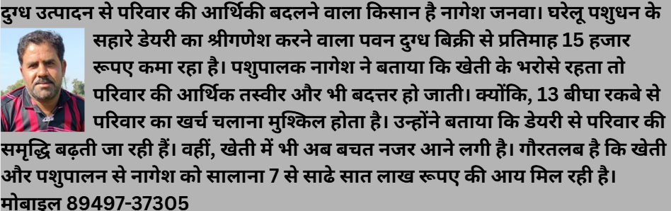 गोठडा, प्रतापगढ। कहते है कि मेहनत करने वालों की कभी हार नहीं होती है। इस बात को साबित कर दिखाया है किसान नागेश जनवा ने। जो खेत के साथ-साथ डेयरी में पसीना बहा रहे है। परिणाम रहा कि डेयरी से प्रतिमाह 15 हजार रूपए की शुद्ध आय मिल रही है। वहीं, खेती से सालाना 4 से 5 लाख रूपए की बचत हो जाती है। किसान नागेश ने हलधर टाइम्स को बताया कि परिवार के पास 13 बीघा जमीन है। उन्होंने बताया कि 12वीं पास करने के साथ ही खेती से जुड़ गया। लेकिन, समय के साथ परिवार के बढते खर्च से पार पाना मुश्किल नजर आने लगा। इस स्थिति को देखते हुए डेयरी को व्यवसाय का रूप दिया। इससे परिवार के आर्थिक हालात पूरी तरह से बदल चुके है। गौरतलब है कि पशुपालक नागेश उत्पादित दुग्ध की बिक्री प्रतापगढ़ में करते है। उन्होने बताया कि गाय का दुग्ध डेयरी बूथ पर दें तो काफी कम भाव मिलते है। जबकि, बाजार में 32 से 35 रूपए प्रति किलो के भाव मिलते है। वहीं, भैंस का दुग्ध 60 रूपए प्रति लीटर की दर से बिक्री कर रहा हॅू। उन्होने बताया कि डेयरी व्यवसाय से परिवार के साथ-साथ पशुधन का खर्च आसानी से निकल जाता है। उन्होंने बताया कि पहले तो पशुधन का प्रबंधन परम्परागत तौर-तरीकों से करता था। लेकिन, बाद में पशुधन का प्रबंधन वैज्ञानिक तरीके से करने लगा। इससे दुग्ध उत्पादन लागत में कमी आई है। वहीं, दुग्ध उत्पादन में वृद्धि के साथ-साथ पशुधन का स्वास्थ्य भी बेहत्तर बना रहता है। उन्होंने बताया कि वर्तमान में पशुओं की संख्या आधा दर्जन से ज्यादा है। इनमें दुधारू पशुओं में 4 गाय, 1 भैंस शामिल है। जबकि, पशुधन की संख्या 10 के करीब है। इनसे प्रतिदिन 30 किलोग्राम दुग्ध का उत्पादन मिल रहा है। दुग्ध विपणन से मासिक रूप से 15 हजार रूपए की बचत मिल रही है।