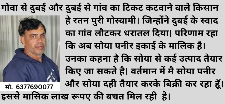 पण्डोली, चित्तौडग़ढ़। जमीन चार बीघा। परिवार का गुजारा चलाने के लिए भी नौकरी करनी पड़ती थी। लेकिन अब सोया पनीर और सोया दही से मासिक लाख रुपये की आमदनी मिल रही है। यह कहना है दुबई रिटर्न रतन पुरी गोस्वामी का। जिन्होंने चित्तौडगढ़ जिले में पहली सोयाबीन प्रसंस्करण इकाई स्थापित कर क्षेत्र के युवाओं और किसानों को नये उद्यम से रूबरू करवाया है। किसान रतन पुरी ने हलधर टाइम्स को बताया कि परिवार के पास 4 बीघा जमीन है। इस जमीन से उस वक्त भी परिवार का गुजारा चलाना मुश्किल था और अब भी। इसी के चलते 10वीं पास करने के साथ ही गोवा चला गया। वहां एक फैक्ट्री में पांच साल काम किया। फिर, 18 साल दुबई में रहा। लेकिन कुछ कारणों के चलते काम छोड़कर गांव लौट आया। यहां आने के बाद रोजगार की समस्या मेरे सामने थी। इसी दौरान मेरा ध्यान दुबई के स्वाद पर गया और यही से मुझे मेरा लक्ष्य मिल गया। इंटरनेट पर तलाश करने के बाद हरियाणा की एक कंपनी के सोया पनीर प्लांट से जुड़ी मशीनरी खरीदी। साथ ही, सोया प्रसंस्कृत उत्पादों का प्रशिक्षण भी प्राप्त किया। गौरतलब है कि किसान रतन को सोया प्रसंस्करण से जुड़े हुए अभी दो साल ही हुए है। लेकिन, मासिक का आय का आंकड़ा लाख रूपए तक पहुंच चुका है।