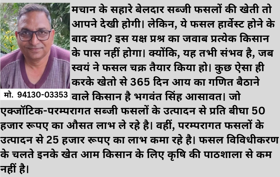 पीपल्दाकलां, कोटा। मचान के सहारे शिखर छूने वाले किसान है भगवंत सिंह आसावत, जो फसल विविधीकरण से अपनी आय बढाने में जुटे हुए है। एक्जॉटिक सब्जी फसलों की खेती के साथ-साथ एफपीओं के माध्यम से किसानों की आय बढाने में जुटे है। साथ ही, इनके खेतों में थ्री लेयर तकनीक से फसल का उत्पादन हो रहा है। इससे 365 दिन खेतों से आय मिलती रहती है। गौरतलब है कि किसान भगवंत सिंह सब्जी फसल से 50 हजार रूपए प्रति बीघा और परम्परागत फसलों से 25 हजार रूपए प्रति बीघा का लाभ प्राप्त कर रहे है। किसान भगवंत सिंह ने हलधर टाइम्स को बताया कि संयुक्त परिवार के मध्य 25 एकड़ जमीन है। एलएलबी करने के बाद मुझे लगा कि खेती में कु छ नया करना चाहिए। इसी धुन में नई-नई तकनीक पर फोकस करता रहा। इससे फसल विविधिकरण को बढ़ावा मिला। साथ ही, आमदनी का आंकड़ा भी बढ़ता रहा। बता दें कि हाड़ौती संभाग में किसान भगवंत का खेती साधारण किसान के लिए खेती की पाठशाला से कम नहीं है। क्योंकि, परम्परागत के साथ-साथ आधुनिक कृषि तकनीक का संगम इनके यहां हो चुका है। उन्होंने बताया कि सिंचाई के लिए ट्यूबवैल है और सोलर पंप लगाया हुआ है। परम्परागत फसलों में गेहूं, चना, मेथी, धनिया, अलसी, तारामीरा, सोयाबीन, उड़द, धान और तिल का उत्पादन लेता हॅू। इससे 25 हजार रूपए प्रति बीघा के हिसाब से लाभ मिल जाता है।