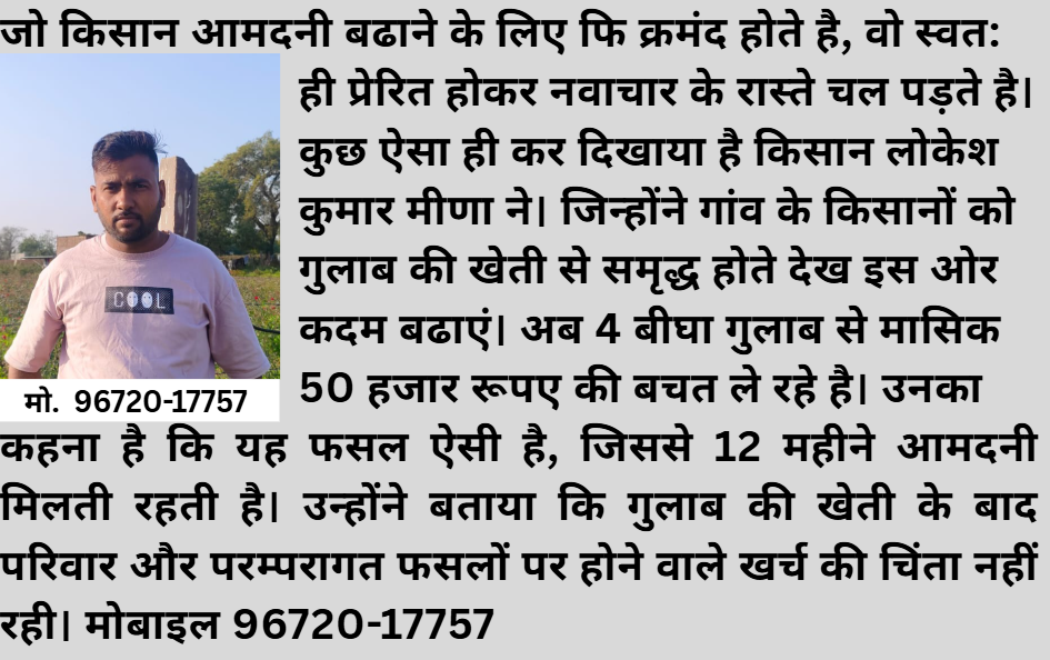 नोताड़ा भोपत, बूंदी। आबोहवा में अपनी खुशबू से खुशनुमा बनाने वाले फूल किसान के जीवन को भी महका देते है। यकीन नहीं है तो मिलिए किसान लोकेश कुमार मीणा से। जो गुलाब की खेती से ना केवल परिवार का रोजमर्रा का खर्च निकाल रहे है। साथ ही, मासिक 50 हजार रूपए की शुद्ध बचत भी प्राप्त कर रहे है। उनका कहना है कि गुलाब की खेती से जुड़े हुए अभी सालभर ही हुआ है। लेकिन, यह पता लग चुका है कि इस फसल से परम्परागत फसलों का खर्च भी निकाला जा सकता है। यानी, परम्परागत फसलों से मिलने वाली आमदनी को शुद्ध बचत माना जा सकता है। किसान लोकेश ने हलधर टाइम्स को बताया कि परिवार के पास 15 बीघा जमीन है। परिजनों के खेती संभालने तक मैने स्नातक की उपाधी ली। इसके बाद आईटीआई का डिप्लोमा लिया। लेकिन, आईटीआई करने के बाद मन बदल गया और किसी दूसरी जगह मेहनत करने की जगह मैने खेतों में मेहनत करने को उचित समझा। इसी का परिणाम गुलाब की खेती है। उन्होंने बताया कि गांव के किसानों से प्ररेणा लेते हुए गुलाब खेती का श्री गणेश किया। परिणाम रहा कि गुलाब की खेती ने भविष्य की चिंता दूर कर दी। उन्होंने बताया कि सिंचाई के लिए मेरे पास ट्यूबवैल है और विद्युत बचत के लिए सोलर पम्प लगा हुआ है। परम्परागत फसलों में गेहूं और धान की फसल का उत्पादन लेता हॅू। इन फसलों से खर्च निकालने के बाद सालाना 5-6 लाख रूपए की आमदनी मिल जाती है।