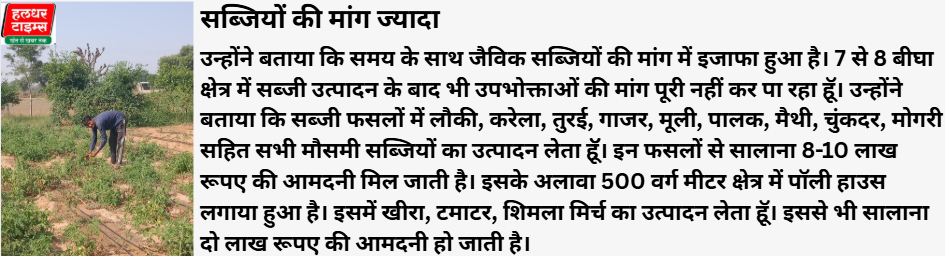 तेजपुरा, जयपुर। हाथों को मेहनत की आदत हो तो खेत भी चमत्कार दिखा देते है। जी हां, ऐसे ही अनुभवों से दोचार है जैविक किसान रामधन चौधरी। जिन्होने जैविक से ना केवल कर्ज चुकता किया। बल्कि, सालाना 15-18 लाख रूपए का शुद्ध मुनाफा भी कमा रहे है। किसान रामधन ने बताया कि जैविक किसान के लिए फायदें का सौदा है। क्योंकि, इसमें उपज की कीमत ज्यादा मिलती है। वहीं, लागत काफी कम हो जाती है। गौरतलब है कि किसान रामधन जैविक सब्जी, अनाज और बागवानी फसलों का उत्पादन ले रहे है। किसान रामधन ने हलधर टाइम्स को बताया कि परिवार के पास साढे 12 बीघा जमीन है। पिताजी के खेती संभालने तक पढ़ाई की। लेकिन, समय के साथ कुछ परिस्थितियां ऐसी बनी की परिवार के ऊपर लाखों रूपए का कर्ज हो गया। इस स्थिति को देखते हुए पहले गाड़ी चलाई। इससे कर्ज से पार पाने के बाद जैविक खेती का रूख किया। जैविक की राह में थोड़ी बहुत परेशानी आई। लेकिन, अब जो फायदा जैविक से मिल रहा है, उसके आगे कुछ नहीं है। उन्होंने बताया कि 8 साल से जैविक तौर-तरीके से फसलो का उत्पादन ले रहा हॅू। खेत पर जैविक आदान की इकाई स्थापित की हुई है। इससे सभी फसलों में काफी लाभ मिल रहा है। उन्होंने बताया कि सिंचाई के लिए एक ट्यूबवैल और दो फार्मपौंड है। परम्परागत फसलों में बाजरा, गेहं, जौ, चना का उत्पादन लेता हॅॅू। इन फसलों से लाभ लेने के लिए मल्टीग्रेन आटा तैयार करके 90 रूपए प्रति किलो की दर से बिक्री कर रहा हॅू।