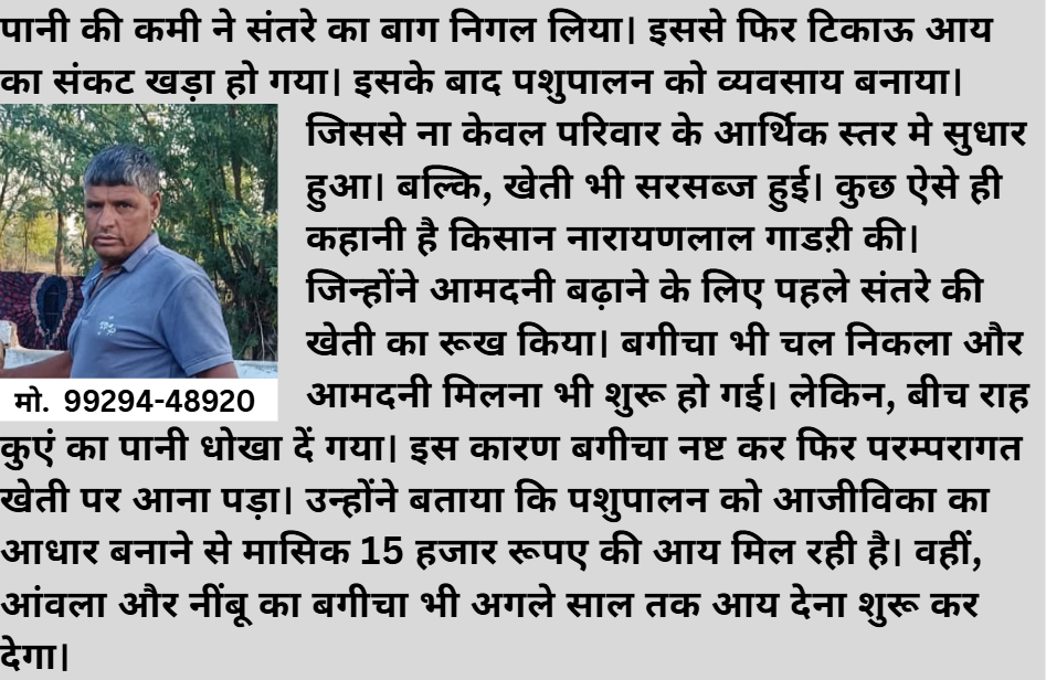 गोविंद सिंह जी का खेड़ा, भीलवाड़ा। मर्ज यह नहीं कि जमीन और हौंसला कम है। मर्ज यह है कि पानी कम है। यही कारण है कि चाहकर भी कई किसान कृषि नवाचार से ऊंची उड़ान नहीं भर पा रहे है। ऐसे ही कुछ अनुभवों से दो चार है किसान नारायणलाल गाडऱी। जिन्होंने पहले संतरा की खेती में भाग्य आजमाया। लेकिन, पानी की कमी बगीचे को निगल गई। इसके बाद पशुपालन को नगद आमदनी का आधार बनाया। परिणाम रहा आमदनी में भी बढौत्तरी दर्ज हुई। वहीं, नई बागवानी फसल को भी खेतों में विस्तार मिला। गौरतलब है किसान नारायण को खेती और पशुपालन से सालाना 4 लाख रूपए की आमदनी मिल रही है। किसान नारायण ने हलधर टाइम्स को बताया कि मेरे पास 20 बीघा जमीन है। 8वीं पास करने के बाद से खेती कर रहा हॅू। उन्होंने बताया कि पहले तो परम्परागत फसलो की खेती तक सीमित रहा। बाद में आमदनी बढाने के लिए संतरे का बगीचा स्थापित किया। उन्होंने बताया कि बगीचे से आमदनी मिलना शुरू हुई तो सूखे की मार सहनी पड़ी। लेकिन, कुछ सालों तक जैसे-तैसे सिंचाई के पानी का जुगाड़ करता रहा। लेकिन, एक दिन वो भी आया, जब पानी की मार के चलते अपने ही हाथो बगीचे को नष्ट करने को मजबूर हुआ। उन्होंने बताया कि टिकाऊ आय का जरिया खत्म होने के साथ पशुपालन को व्यवसाय का रूप दिया। उन्होंने बताया कि वर्तमान में परिवार की जो आर्थिक स्तर है, वह पशुपालन का भी परिणाम है। उन्होंने बताया कि इस व्यवसाय के दौरान आई परेशानियों ने मुझे कृषि विज्ञान केन्द्र से जोडऩे का काम किया। यही से परम्परागत फसलो के बेहत्तर उत्पादन के गुर सीखने को मिले। इससे भी आय बढाने में मदद मिली। उन्होंने बताया कि सिंचाई के लिए मेरे पास कुआं है। परम्परागत फसल में गेहूं, चना, मसूर, मक्का और मूंग का उत्पादन लेता हॅॅू। इन फसलों से खर्च निकालने के बाद दो लाख रूपए की आमदनी मिल जाती है।