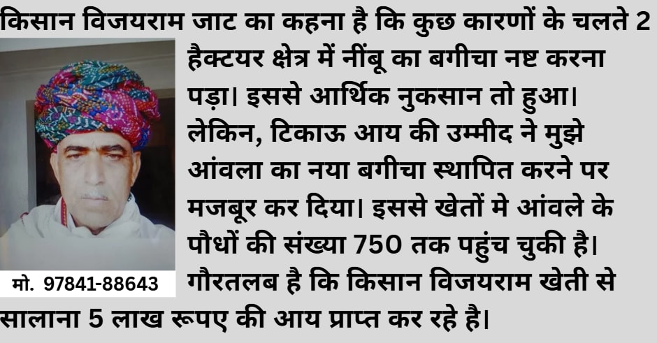 फलीचड़ा, उदयपुर। हौंसला है तो बुलंदियां छूने में ज्यादा समय नहीं लगता। यह साबित कर दिखाया है किसान विजयराम जाट ने। नींबू की खेती में नुकसान खाने के बाद भी इनके हौंसले कम नहीं हुए। क्योंकि, पिछले साल ही आंवला के 300 पौधें लगाए है। इसी के साथ खेत में आंवला पौधों की संख्या 750 हो चुकी है। हालांकि, नए-पुराने पौधों से अभी आमदनी नहीं मिली है। लेकिन, टिकाऊ आय की गणित खेतों में लिखी जा चुकी है। वर्तमान में 5 लाख रूपए की आय विजयराम को मिल रही है। किसान विजयराम ने हलधर टाइम्स को बताया कि हम तीन भाईयों के बीच 40 बीघा कृषि भूमि है। उन्होने बताा कि 10वीं पास करने के बाद मोटर बांइडिग़ का काम शुरू किया। साथ ही, खेती के काम में भी हाथ बटाता रहा। लेकिन, अब पूरी तरह से खेती से जुड़ चुका हूॅ। इससे खेतों में नवाचार भी नजर आने लगे है। खेत समन्वित कृषि की कहानी बयां करने लगे है। उन्होंने बताया कि सिंचाई केलिए कुआं है। लेकिन, समय के साथ पानी रीत गया। इसके चलते परम्परागत फसल उत्पादन पर भी संकट गहरा गया। इसके बाद ट्यूबवैल खुदवाया। लेकिन, पानी की पीड़ बनी रही। इसकों देखते हुए सामुदायिक फार्म पौंड का निर्माण करवाया। इससे अब रबी-खरीफ फसलो का अच्छा उत्पादन मिलने लगा है। साथ ही, जायद मौसम में सब्जी उत्पादन की तैयारी भी शुरू कर चुका हॅू। उन्होंने बताया कि परम्परागत फसलों में गेहूं, सरसों, मसूर, मक्का, मूंगफली, सोयाबीन का उत्पादन लेता हॅू। इन फसलों से खर्च निकालने के बाद 3 से साढे तीन लाख रूपए की आमदनी मिल जाती है। विद्युत बचत के लिए सौर उर्जा पम्प और जल बचत के लिए ड्रिप लगाई हुइ है।
