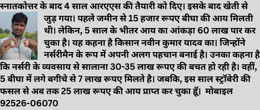 कोटपूतली-शाहपुरा। स्नातकोत्तर के बाद राजस्थान प्रशासनिक सेवा का लक्ष्य तय किया। लेकिन, कुछ कारणों से अधूरा रहा। यह कहना है नवीन कुमार यादव का। जो अब नर्सरीमैन के रूप में अपनी पहचान बना चुके है। साथ ही, बागवानी और स्ट्रॉबेरी जैसी नगदी फसलों का उत्पादन ले रहे है। गौरतलब है कि किसान नवीन ने खेती की जिम्मेदारी संभालने के बाद आईसीएआर के अलग-अलग संस्थानों से प्रशिक्षण लिए और अब घर बैठे सालाना 60 लाख रूपए सालाना से अधिक की आय प्राप्त कर है। इस साल 4 बीघा स्ट्रॉबेरी की फसल से 25 लाख रूपए की आय अब तक प्राप्त कर चुके है। किसान नवीन ने हलधर टाइम्स को बताया कि परिवार के पास 6 बीघा जमीन है। उन्होंने बताया कि पढ़ाई करने के दौरान कभी खेती के बारे में सोचा नहीं था। लेकिन, अब खुश हूूं कि किसान बनकर एक अधिकारी से ज्यादा आमदनी प्राप्त कर रहा हूॅ। उन्होने बताया कि वर्ष 2017 में स्नातकोत्तर के बाद राजस्थान प्रशासनिक सेवा में जाने का लक्ष्य रखा। चार साल तैयारी की। लेकिन, लक्ष्य उम्मीदों से दूर रहा। इसके चलते खेती से जुड़ा। उन्होंने बताया कि खेती की शुरूआत ही बागवानी फसलों से की। मौसमी, संतरा और अमरूद का बगीचा स्थापित किया। ताकि, टिकाऊ आय खेतो से मिलती रहे। उन्होंने बताया कि बगीचा पांच साल का हो चुका है। 5 बीघा क्षेत्र में करीब 750 पौधें तीनों ही फसलों के लगे हुए है। इससे करीब 6 लाख रूपए की आमदनी मिलने लगी है। उन्होने बताया कि एक बीघा जमीन मेें परिवार की आवश्यकता पूर्ति के लिए गेहंू का उत्पादन लेता हॅू।