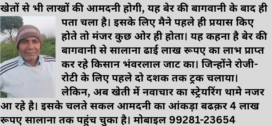भानपुरा, जयपुर। ...कांटो से दोस्ती कर ली। जी हां, कांटो से प्यार करके सफलता की कुछ ऐसी ही पटकथा लिखी है किसान भंवरलाल जाट ने। जिन्होंने दो जूण की फ्रिक में करीब दो दशक तक ट्रक चलाया। लेकिन, अब बेर की बागवानी से सालाना ढ़ाई लाख रूपए की आय ले रहे हे। जबकि, सकल आय का आंकड़ा 5 लाख रूपए के करीब है। किसान भंवरलाल ने हलधर टाइम्स को बताया कि 10वीं पास करने के साथ ही पढ़ाई छोड़ दी। समय के साथ जिम्मेदारी बड़ी तो रोजी-रोटी के लिए ट्रक चलाना शुरू कर दिया। करीब दो दशक तक यह काम किया। इसके बदले 16 हजार रूपए तनख्वा मिलती थी। उन्होंने बताया कि इस दौरान परिवार के सदस्य खेती-बाड़ी की जिम्मेदारी संभालते रहे। लेकिन, वर्ष 2020 में ड्राइवरी का काम छोडक़र गांव लौट आया और कांटो से दोस्ती कर ली। उन्होंने बताया कि क्षेत्र में भू-जल स्तर गहरा है। इस कारण कम पानी में बेहत्तर पैदावार देने वाली फसल के बारे में पता किया तो बेर का नाम सामने आया। इसके बाद एक हैक्टयर क्षेत्र में थाई बेर का बगीचा स्थापित किया। उन्होंने बताया कि तीन साल बाद उत्पादन मिलना शुरू हुआ तो आय बढने की उम्मीद बंधी। वर्तमान में बेर का उत्पादन जारी है। जबकि, पिछले साल बेर से शुद्ध ढ़ाई लाख रूपए की आमदनी मिली थी। उन्होंने बताया कि सिंचाई के लिए मेरे पास कुआं है।
