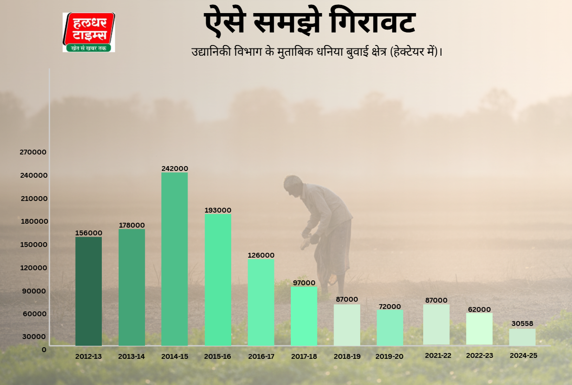 (सभी तस्वीरें- हलधर)जयपुर। धनिया की खुशबू के साथ निर्यात में पहचान रखने वाले हाड़ौती क्षेत्र में अब धनिया की खेती हाशिए पर पहुंच चुकी है। भविष्य में भी हालत वर्तमान जैसे ही बने रहे तो हाड़ौती मेें धनिया ढूंढने से नहीं मिलेगा। गौरतलब है कि वर्ष 2012-13 में हाड़ौती संभाग में 1.56 लाख हैक्टयर क्षेत्र में धनिया की बुवाई होती थी। जो वर्ष 2024-25 में घटकर महज 30 हजार हैक्टयर क्षेत्र पर आ टिकी है। ऐसे में धनिया फसल के साथ-साथ निर्यात पर भी संकट के बादल मंडराते नजर आने लगे है।