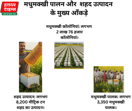 (सभी तस्वीरें- हलधर)जयपुर। मुख्यमंत्री भजनलाल शर्मा के नेतृत्व में प्रदेश के किसानों के आर्थिक सशक्तीकरण के लिए निरंतर कार्य किए जा रहे हैं। राज्य सरकार की जनोन्मुखी नीतियों से राजस्थान भारत के कुल शहद उत्पादन में 9 प्रतिशत के योगदान के साथ अब उत्तर प्रदेश, पंजाब, हरियाणा और बिहार के साथ देश के पांच सबसे बड़े शहद उत्पादक राज्यों में शामिल हो गया है। मधुमक्खी पालन अब कृषकों के लिए आय का बड़ा स्रोत बन गया है। किसान खेती के साथ शहद उत्पादन कर अपनी आय को दोगुना कर पा रहे हैं। राज्य में अलवर, भरतपुर और हनुमानगढ़ शहद उत्पादन में अग्रणी जिले हैं। राज्य सरकार द्वारा मधुमक्खी पालन को बढावा देने के लिए वर्ष 2025-26 में 50 हजार मधुमक्खी कॉलोनियां और 50 हजार मधुमक्खी बॉक्स वितरित किए जा रहे हैं।