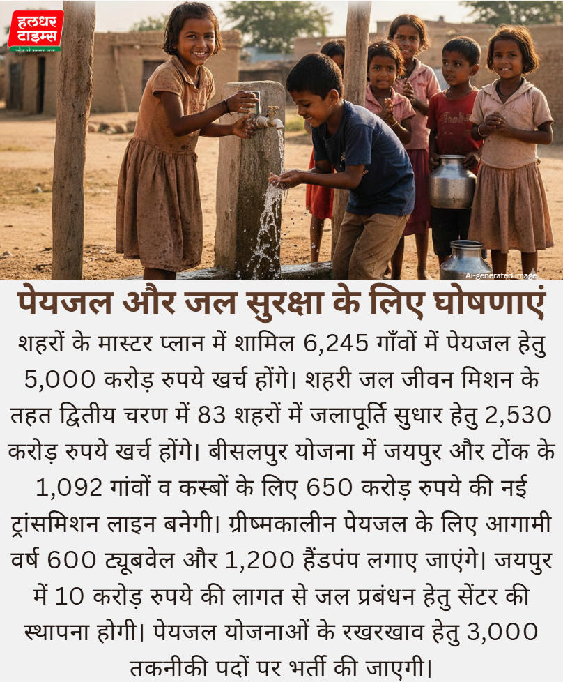 बजट में वीबी जी राम जी योजना के लिए 4 हजार करोड़ रुपये का प्रावधान किया गया है। यमुना जल को शेखावाटी क्षेत्र तक लाने के लिए 32 हजार करोड़ रुपये के कार्य शुरू होंगे। रामजल सेतु लिंक परियोजना में 26 हजार करोड़ रुपये के कार्यादेश जारी किए जा चुके हैं। सभी जिला मुख्यालयों पर नमो नर्सरी, पंचायत स्तर पर नमो पार्क और 16 जिलों में ऑक्सीजोन स्थापित किए जाएंगे।