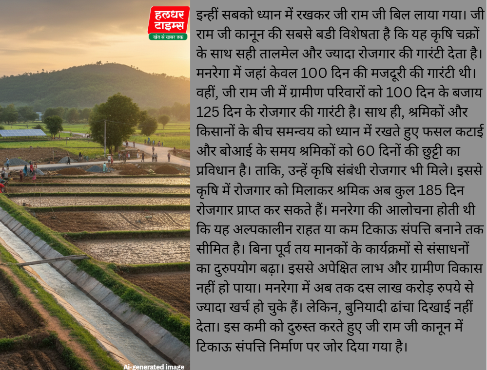 (सभी तस्वीरें- हलधर)इन्हीं कारणों से 2005 से प्रभावी नरेगा, जिसे 2009 में मनरेगा कहा गया की जगह मोदी सरकार ने वीबी जी राम जी कानून का श्रीगणेश किया। स्वाधीनता के बाद से ही जरूरत के हिसाब से विभिन्न योजनाओं के स्वरूप में बदलाव किए जाते रहे हैं। 1960 के दशक में तत्कालीन सरकार ने ग्रामीण रोजगार योजनाओं की शुरुआत की और ग्रामीण श्रमशक्ति कार्यक्रम लागू किए गए। समय की मांग के अनुरूप समय-समय पर विभिन्न सरकारें इनमें फेरबदल करती रहीं। परिणामस्वरूप देश में राष्ट्रीय ग्रामीण रोजगार कार्यक्रम , ग्रामीण भूमिहीन रोजगार गारंटी कार्यक्रम, संपूर्ण ग्रामीण रोजगार योजना और रोजगार आश्वासन योजना इत्यादि लागू की गईं। 2005 में राष्ट्रीय ग्रामीण रोजगार गारंटी अधिनियम(नरेगा) कार्यक्रम शुरू किया गया। 2009 में इसमें महात्मा गांधी का नाम जोड़कर नरेगा से मनरेगा कर दिया गया। नए और तेजी से बदलते आर्थिकए सामाजिक और तकनीकी परिदृश्य में मनरेगा एक प्रभावी योजना के तौर पर खरी साबित नहीं हो पा रही थी। साथ ही इसमें बडे पैमाने पर भ्रष्टाचार हो रहा था। इसके अतिरिक्त मनरेगा एक कल्याणकारी गरीबी उन्मूलन कानून के रूप में सीमित था। जबकि, आज का ग्रामीण युवा विकसित भारत-2047 के सपनों को साकार करने के लिए संकल्पित है।